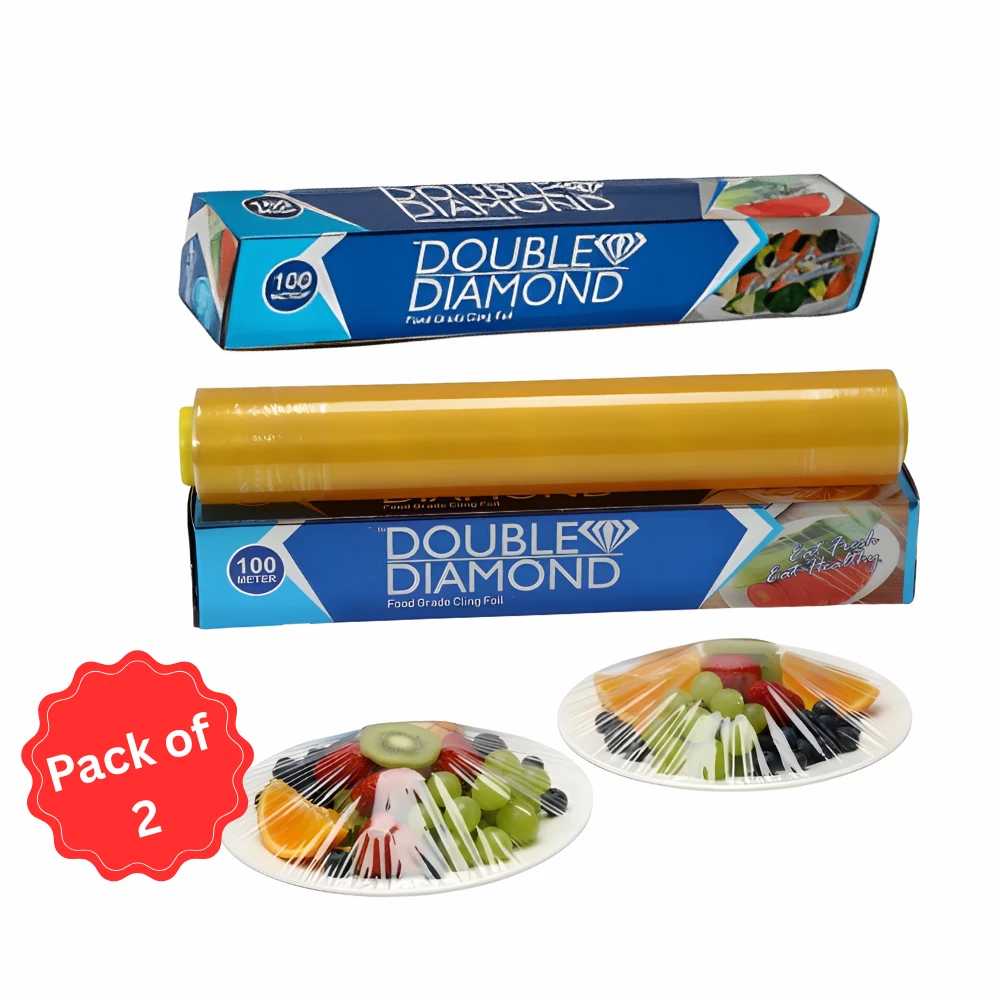 DOUBLE DIAMOND Food Grade Cling Film, 100 Meter Roll Pack Of 2 | Cling Wrap for Food Wrapping & Packing